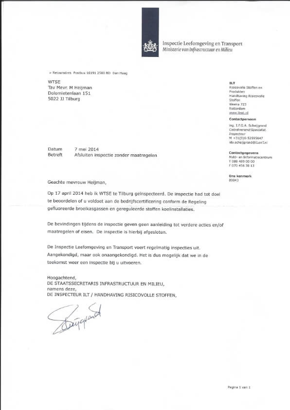 Op 7 mei 2014 is WHTM geïnspecteerd door het Ministerie van Infrastructuur en Milieu. De inspectie had tot doel om te beoordelen of het bedrijf voldoet aan de bedrijfcertificering comform de Regeling gefluoreerde broeikasgassen en gereguleerde stoffen koelinstallaties. De inspectie is afgesloten zonder maatregelen.